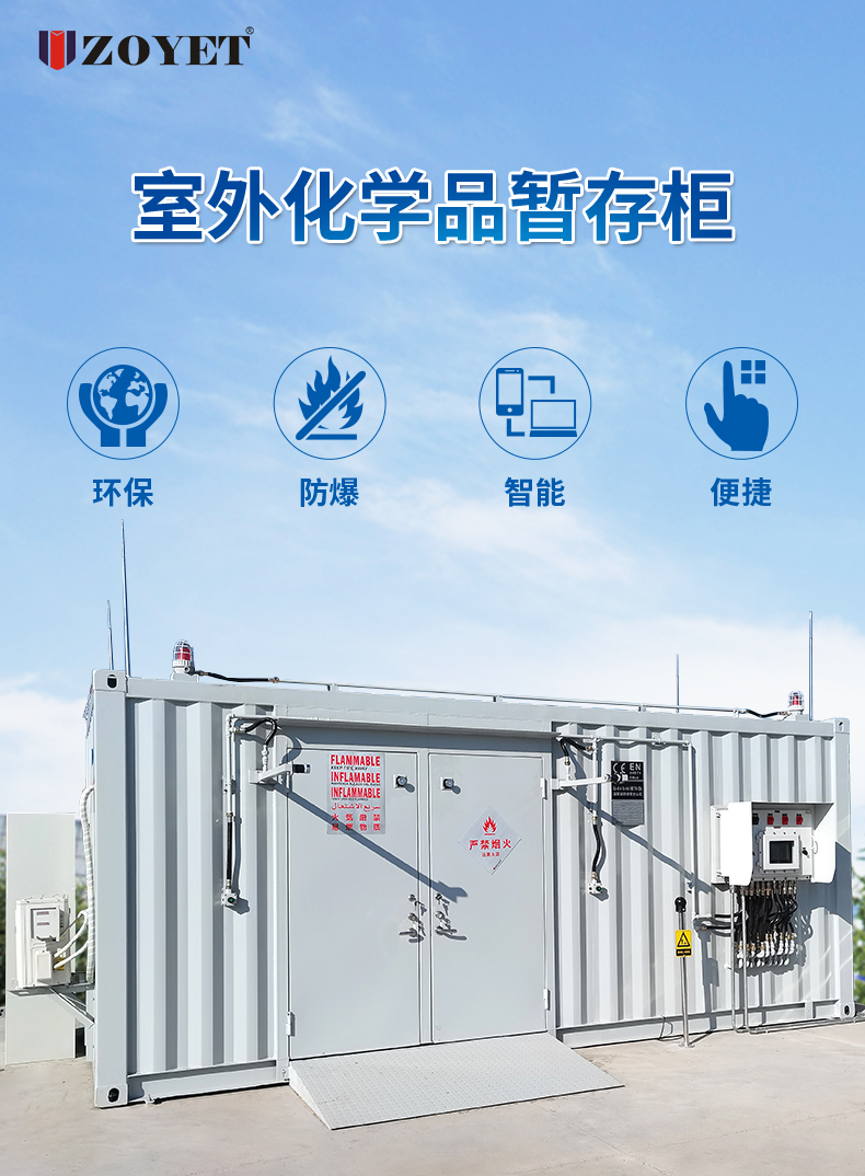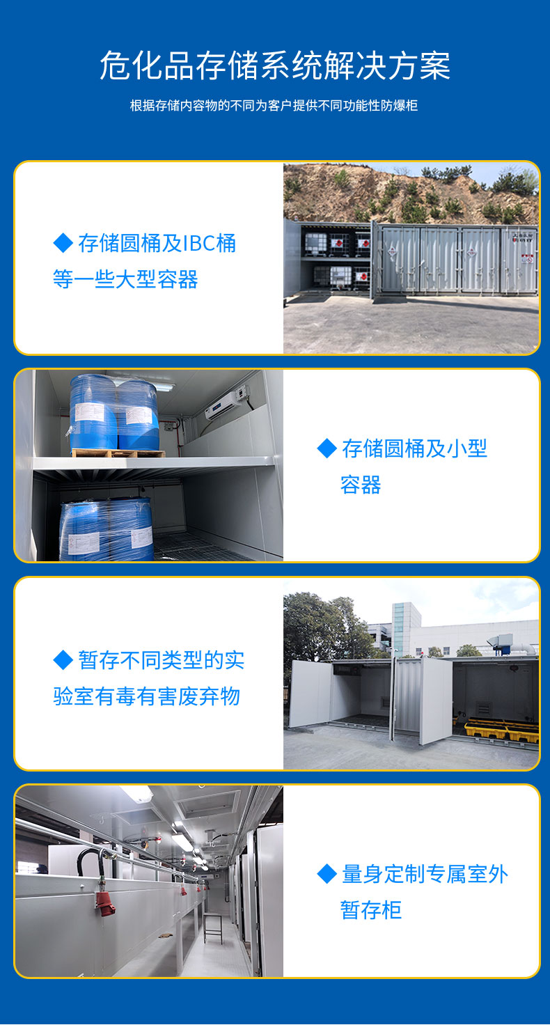 在存储作业中,根据存放物品选择不同的化学品集装箱:层架式化学品集装箱主要用于存储圆桶及IBC超大容器;步入式化学品集装箱主要用于存放圆桶和小型容器;废弃物暂存柜主要用于暂存各类实验室危险废弃物。