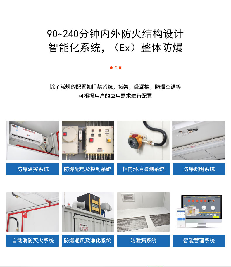 ◇ 舱内自动消防灭火系统、喷淋降温系统、温湿度控制系统、漏液回收系统、照明系统 、排气通风系统、自动报警系统及防爆供电系统;
