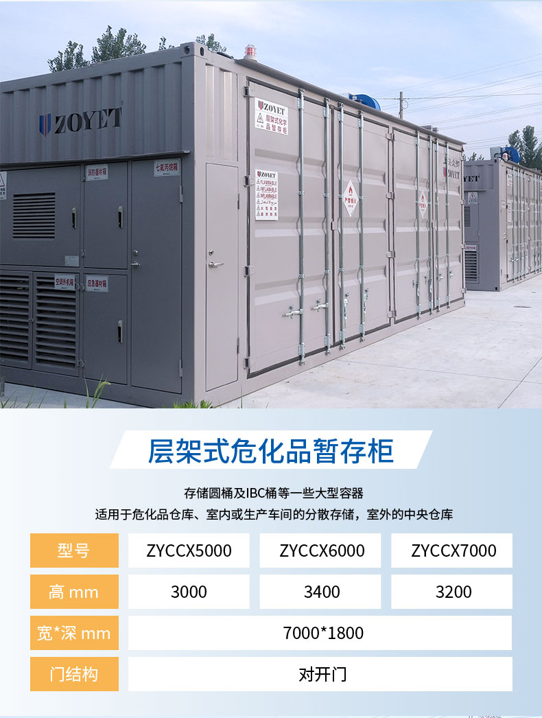 室外化学品集装箱目前分为三个类别,层架式、步入式和实验室废弃物暂存柜,可根据实际需求选择集装箱类别。